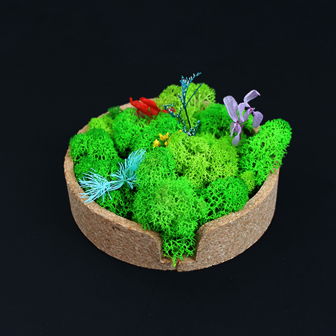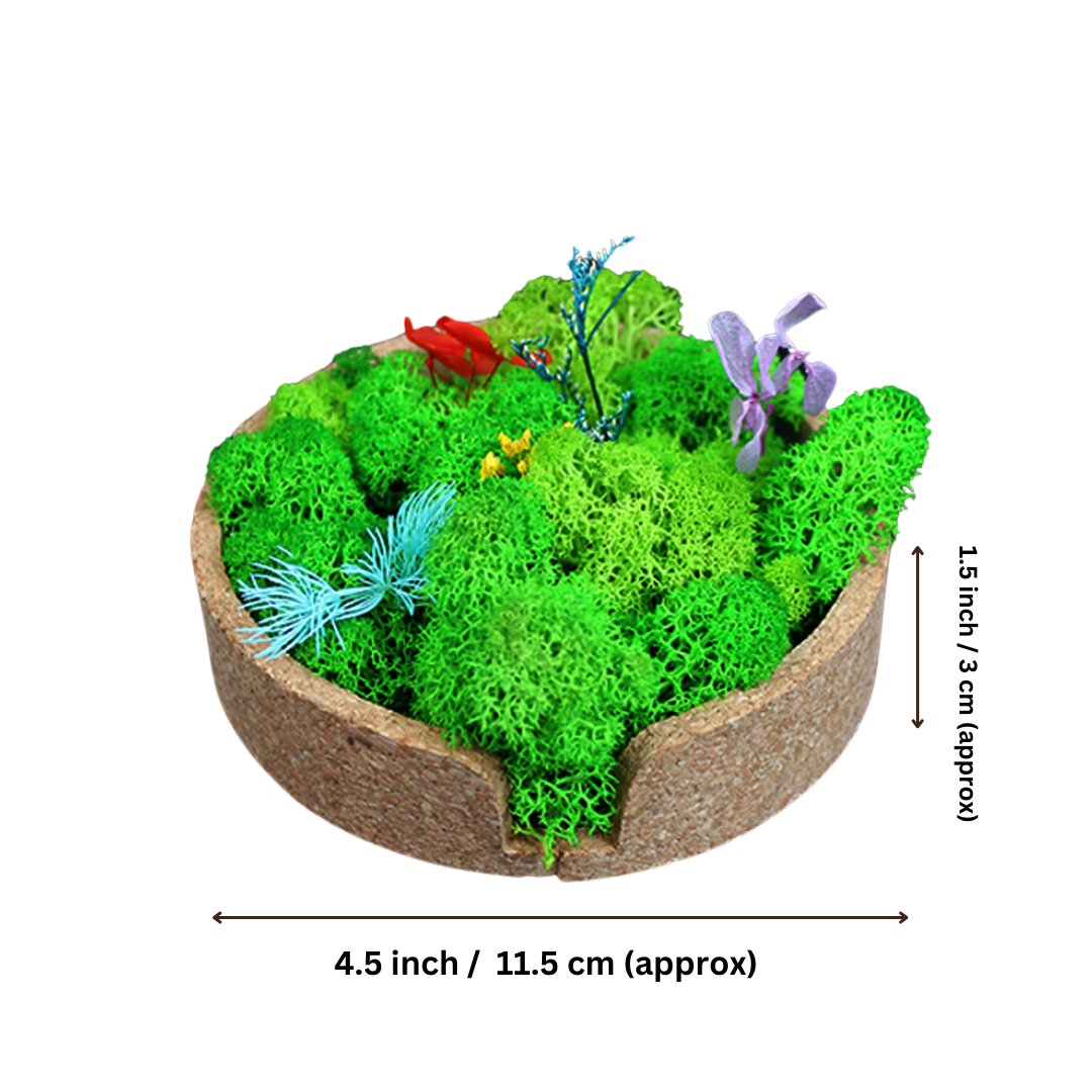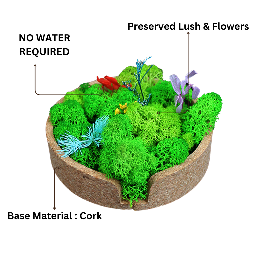 Green Twig adds a fresh, natural touch to any space. This small, vibrant piece fits perfectly on desks, tables, or walls. It's made from an eco-friendly cork bowl, filled with preserved moss and dried flowers that stay beautiful—no water needed.
