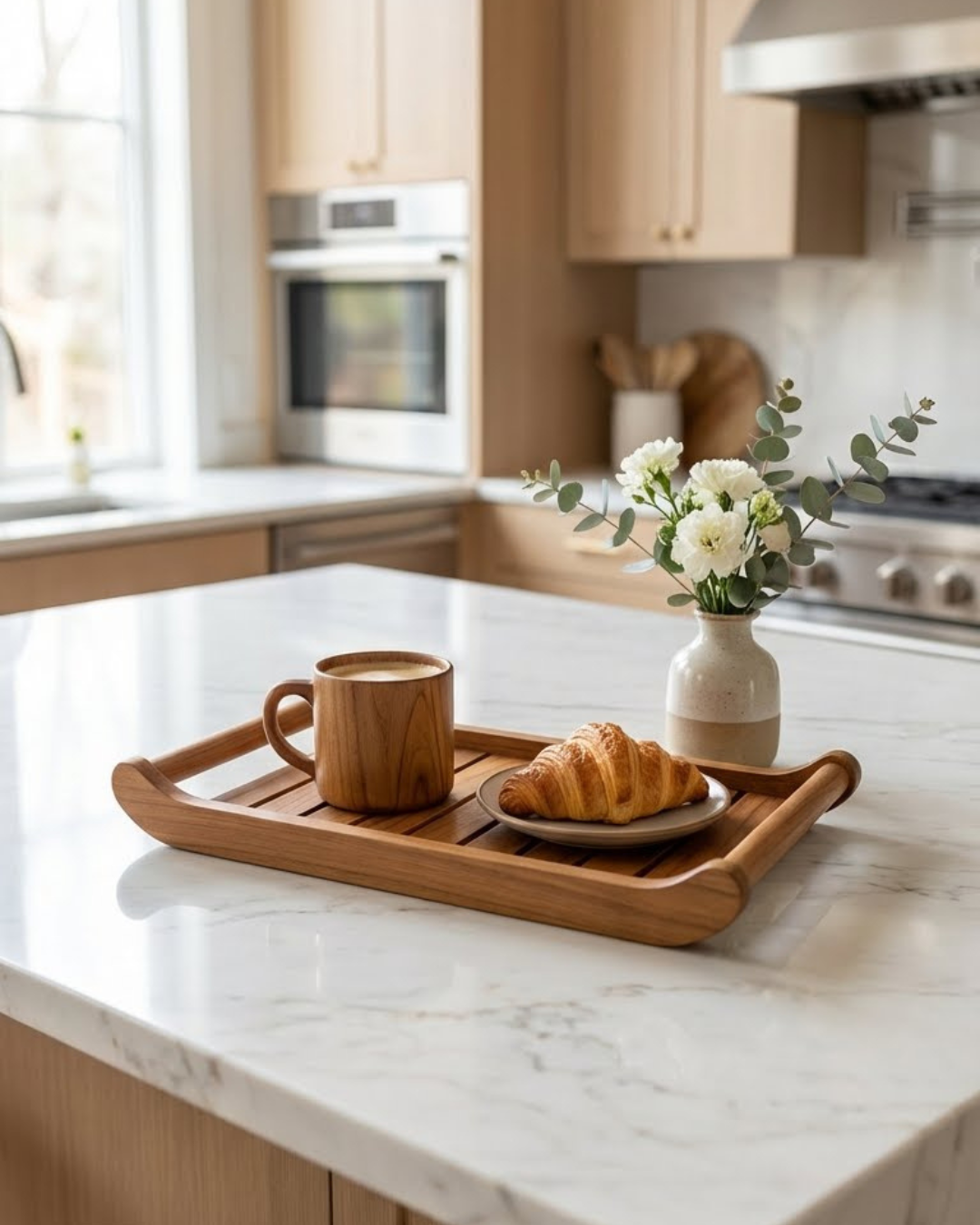 Crafted from durable natural teak wood, this serving tray is ideal for daily use or entertaining. It features clean lines, a flat base, and solid handles for a strong grip. Use it to serve tea, coffee, snacks, or display your favorite decor. The wood’s natural tone complements both modern and classic interiors. Lightweight yet strong, it’s a practical choice for any room. Whether you're hosting or just enjoying a quiet meal, this tray does the job with ease. It also makes a thoughtful gift for housewarmings or festive occasions.